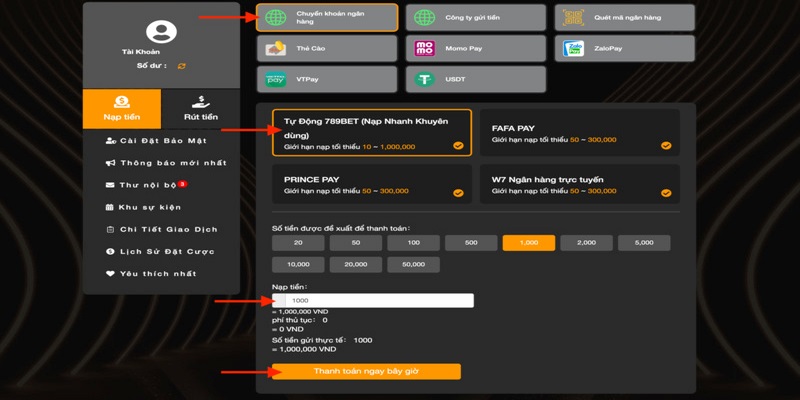 Kênh thanh toán tại nhà cái rất đa dạng phương thức thực hiện. Người chơi chỉ cần chọn một trong những cách thức sau là có thể lên vốn nhanh chóng: